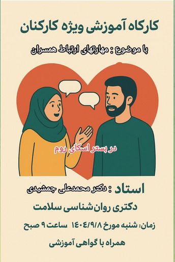 کارگاه آموزشی ویژه کارکنان با موضوع مهارتهای ارتباط همسران به صورت اسکای روم برگزار می شود. 1404/09/08 اخبار,تصاویر اسلایدی 3 کمتر از یک دقیقه لینک ورود به کارگاه در بستر اسکای روم : https://www.skyroom.online/ch/yumscme/nahad